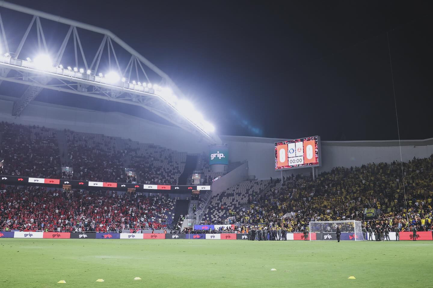 A játékot az első percekben leállították, miután a pályát füstbombákkal és petárdákkal dobálták meg.